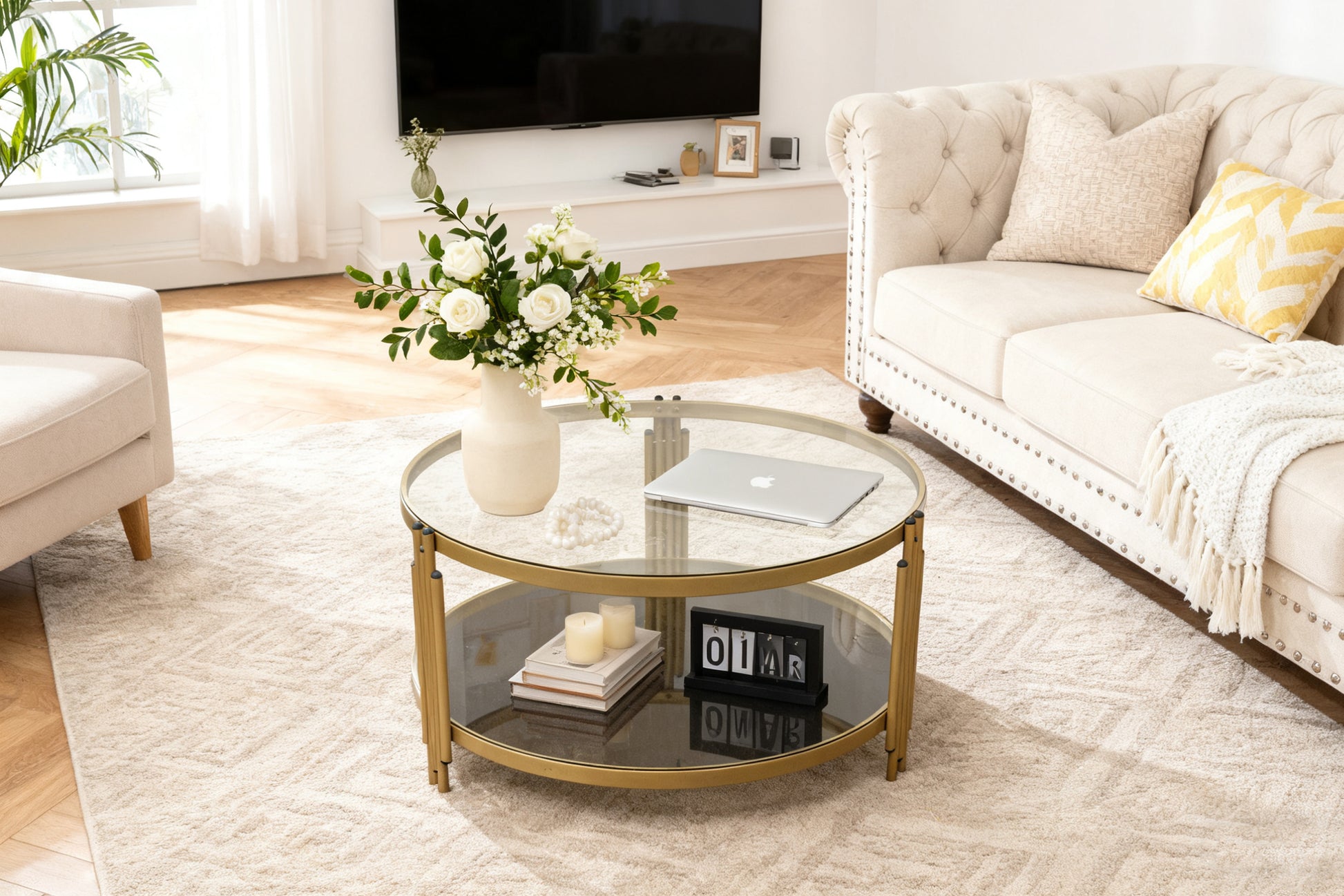 Round Coffee Table, Glass Surface Top & Sturdy Metal Legs Sofa Table for Living Room Modern Design Home Furniture
